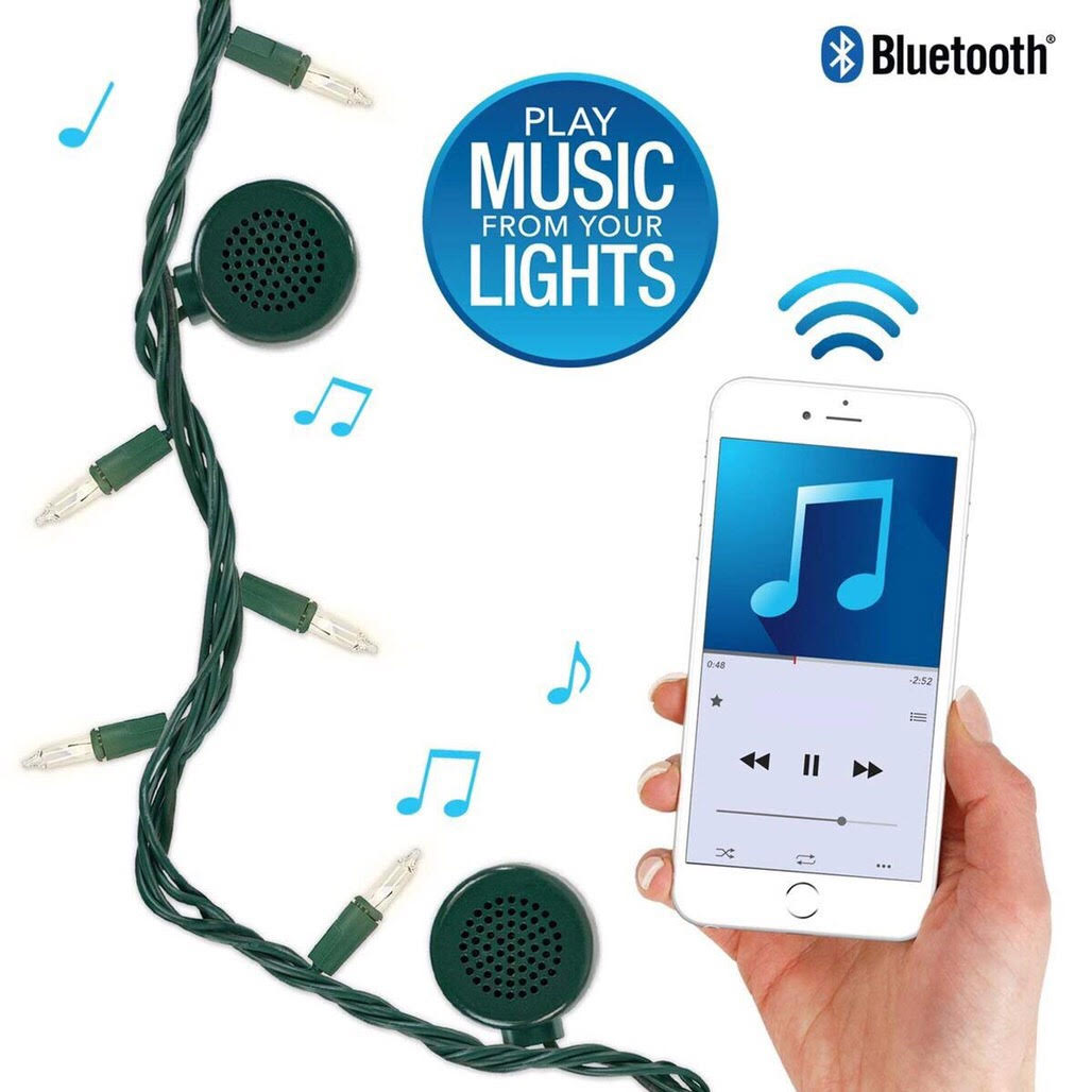 - The string lights features include 70 LED lights with 8 different modes and 4 speakers on 33 feet of cord, and built-in Bluetooth technology to to wirelessly stream music from any Bluetooth enabled device.